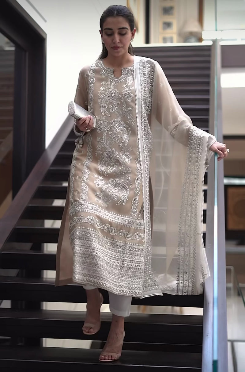 An ode to classic elegance, Timeless showcases intricate embroidery layered over a soft, neutral base, paired with a delicately detailed dupatta. Designed for moments that call for quiet luxury, this ensemble blends traditional craftsmanship with a refined silhouette perfect for formal occasions and celebratory evenings.